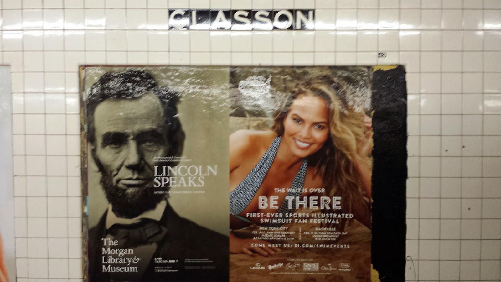 Objects: There are two main titles in the first poster. Capitalized, white letters are placed to the right of Mr. President's mouth, as if he is speaking, the text reads, "LINCOLN SPEAKS." Verrrrry clever. Then there is white text placed at the bottom left corner that reads, "The Morgan Library & Museum." There is no cleverness in this placement, it's purely informational. Amongst the second poster, a logo lives somewhere in the compositon of the Sports Illustrated family. This is a fairly interesting logo and the family of text also has promise, but it's all lost in boobs. It took me a few weeks to notice these posters even said anything, and unfortunately, once I got around to looking past the boobs and reading the text, I had missed the Sports Illustrated event it was originally advertising.